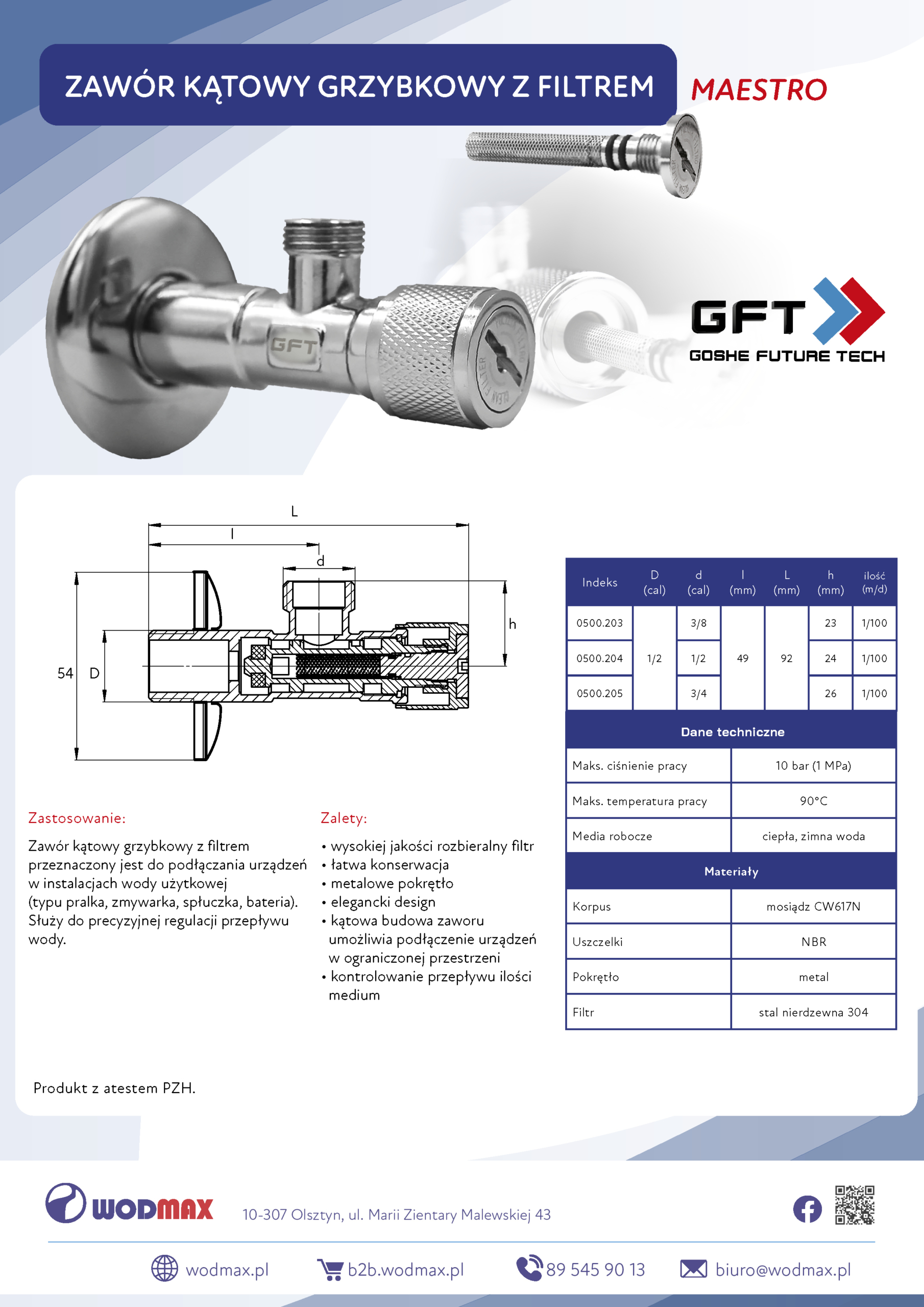 Zawór kątowy grzybkowy z filtrem Maestro Goshe Future Tech przeznaczony jest do podłączania urządzeń w instalacjach wody użytkowej (typu pralka, zmywarka, spłuczka, bateria).